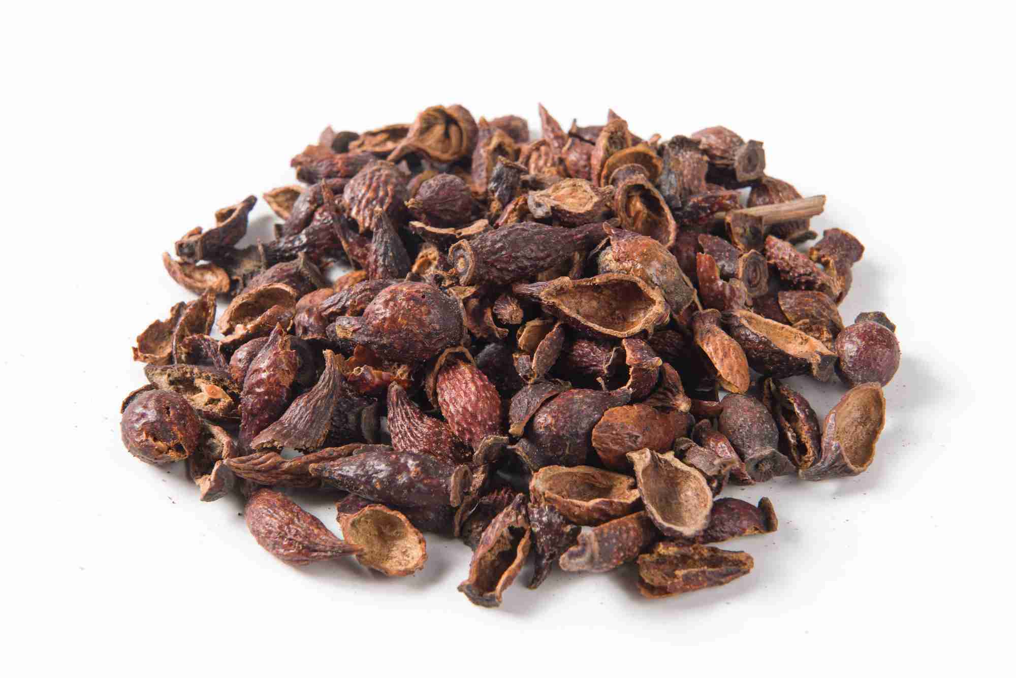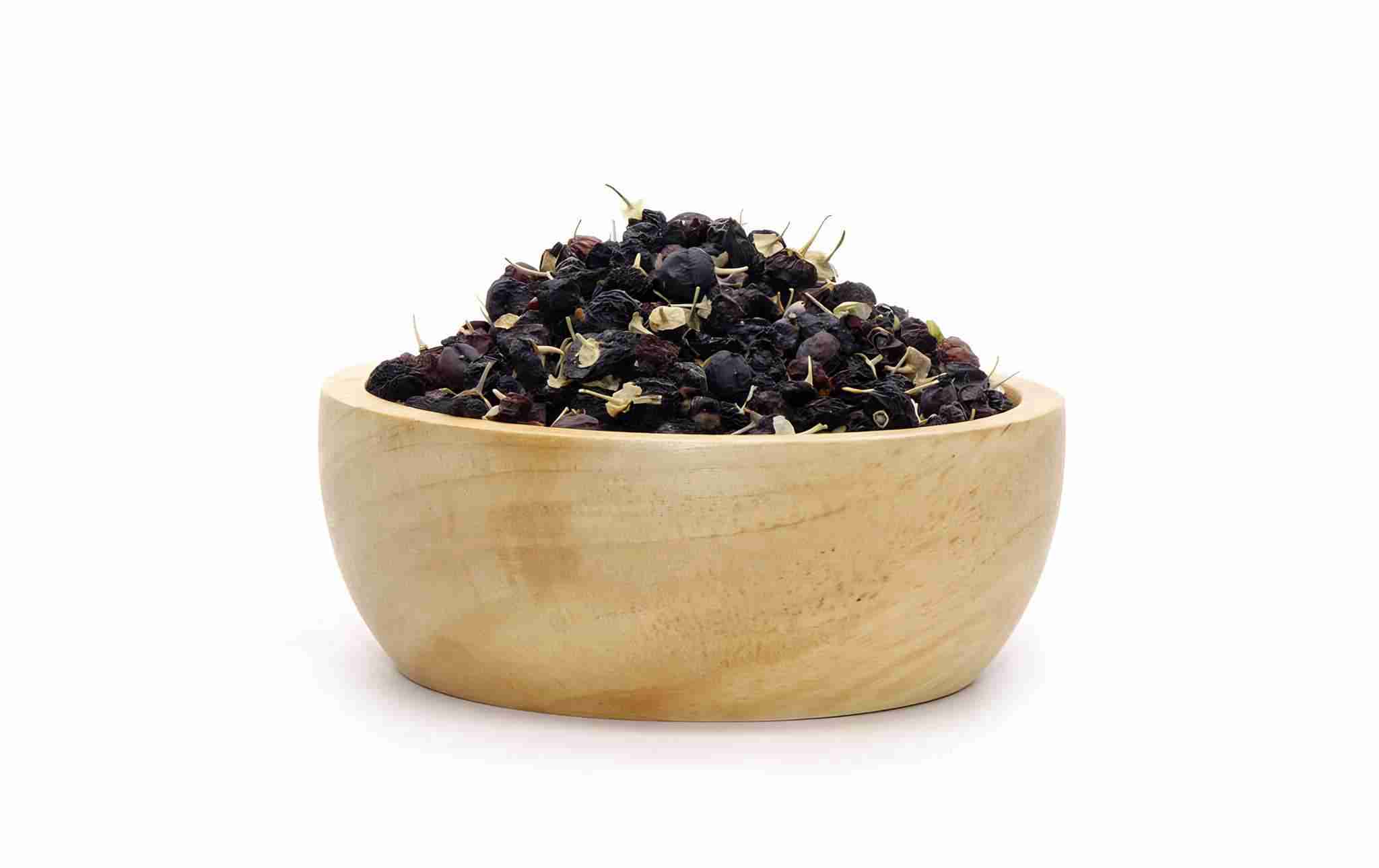Black wolfberry in wooden bowl isolated on white background. Commonly known as black fruit wolfberry