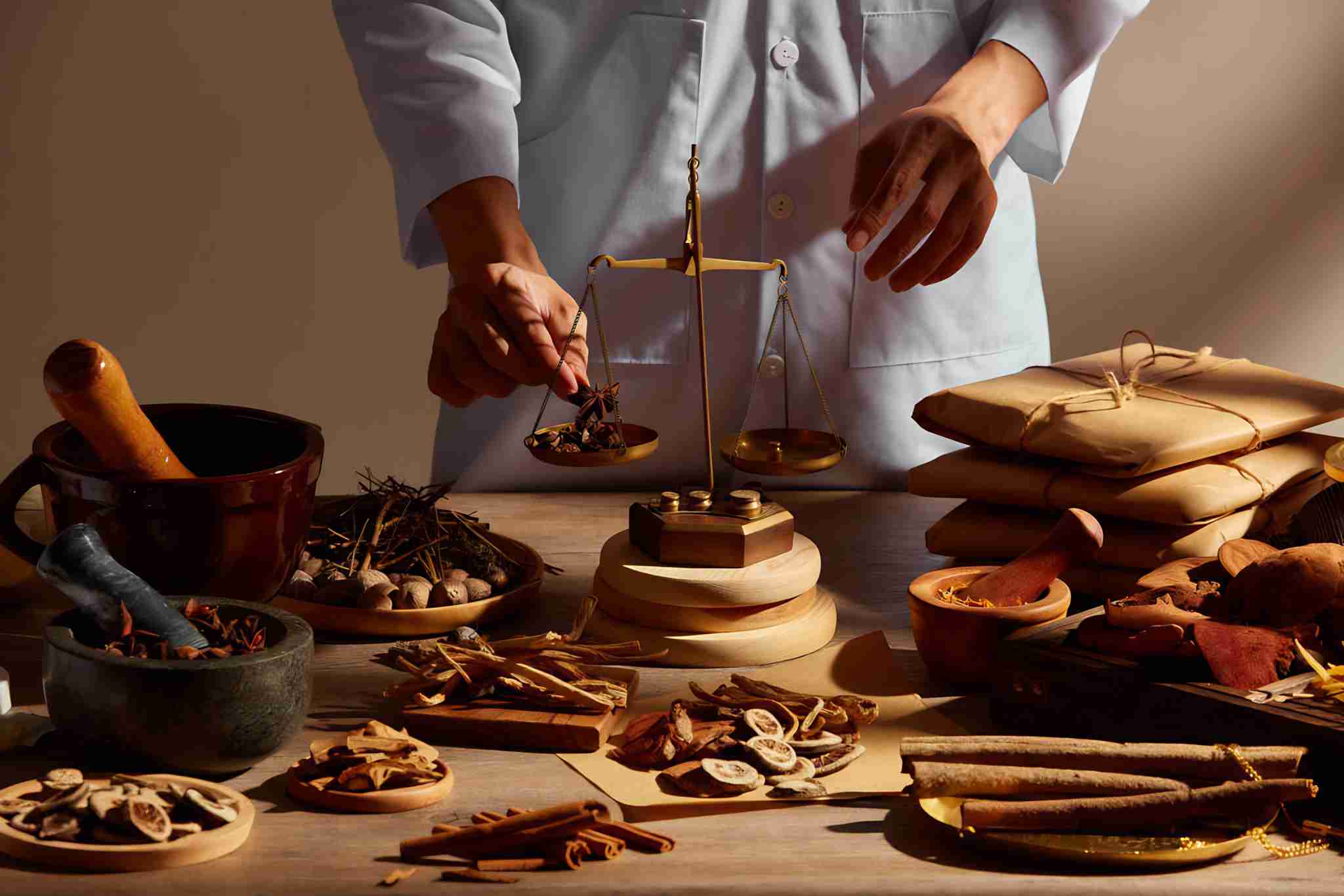 Traditional chinese medicine with herb and spices in brown wooden background and a doctor for advert